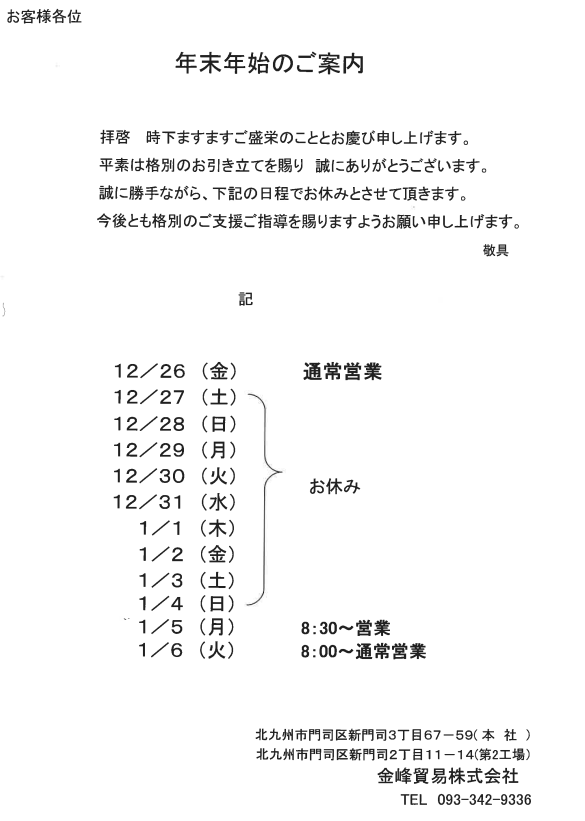 2025年12月26日 / 最終更新日時 : 2025年12月26日 kinho_admin お知らせ 年末年始 休業日につきまして いつもホームページをご覧いただき有難うございます! 早速ではございますが、 弊社年末年始の営業日、休業日は下記の通りです。 ↓弊社Instagram 絶賛投稿中です!↓ 皆様の”フォロー”と”いいね”をいただけましたら幸いです!